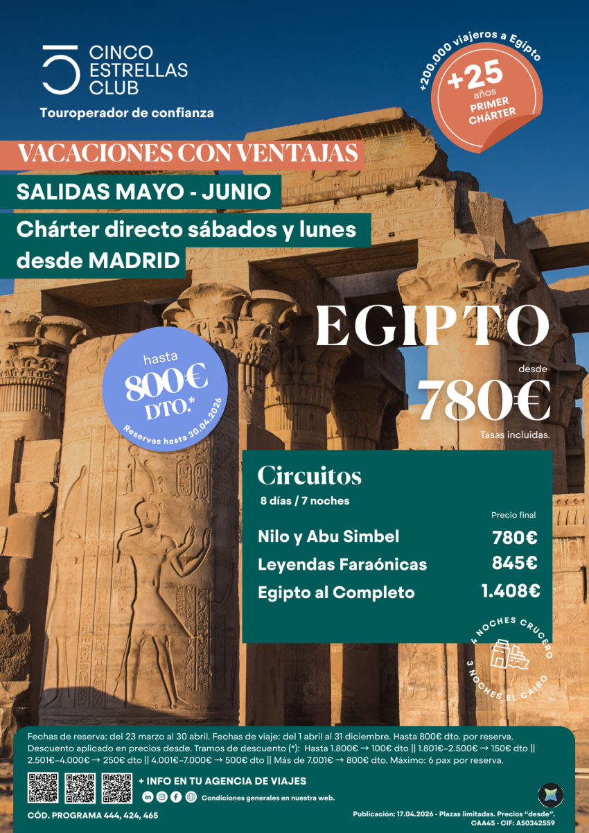 Hast 800€dto reserv. hst 30.04| Egipto dsd 780€ 8ds/7ns sal. sab-lunes mayo-junio sal. desde Madrid